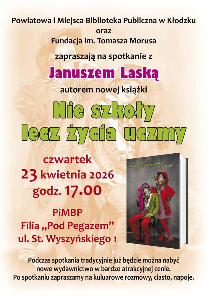 NIE SZKOŁY, LECZ ŻYCIA UCZMY! Powiatowa i Miejska Biblioteka Publiczna w Kłodzku oraz Fundacja im. Tomasza Morusa zapraszają na spotkanie z Januszem Laską - autorem książki pt. NIE SZKOŁY, LECZ ŻYCIA UCZMY. 23 kwietnia godz. 17.00 Filia PiMBP "Pod Pegazem", ul. S. Wyszyńskiego 1. ZAPRASZAMY!!!
